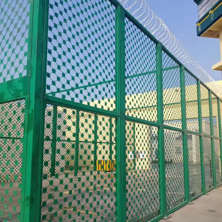 梅花刺片監獄護欄網是由V型支架立柱、加強型焊接片網、安全防盜連接件和熱鍍鋅刀片刺籠組成,強度和安全防御性級別很高。近年來,被廣泛應用在監獄,看守所、軍事基地等高安全場所。梅花刺片監獄護欄網邊框與立柱采用螺栓固定邊耳式連接,邊耳均為50*50*5mm扁鐵,邊耳螺孔可調,調節距離不小于20mm;邊耳固定螺栓為直徑14mm*50mm全絲熱鍍鋅安全螺栓、螺母,每片網單邊連接點為8個以上。梅花刺片監獄護欄網全體銜接共同,框網方正,對角線差錯不大于2cm,阻隔網全體銜接共同,框網方正,對角線差錯不大于2cm。