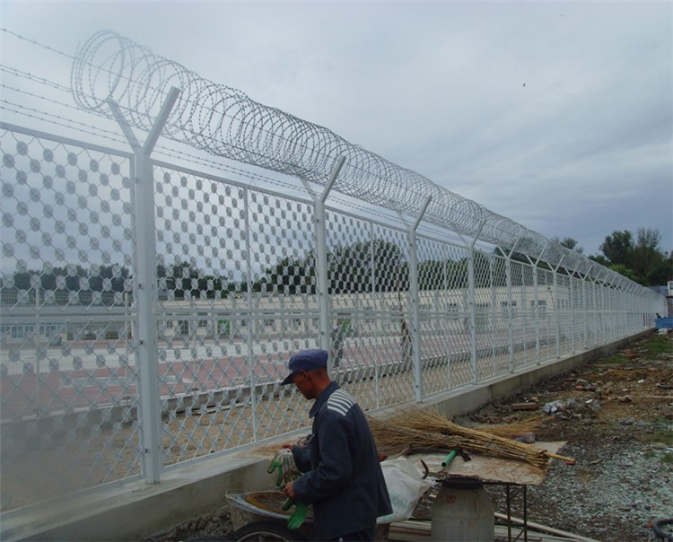 二:監獄太陽花護欄網立柱采用Y型鍍鋅鋼管:壁厚100*100*3mm/網片邊框30*50*2.0m、Y型立柱安裝不銹鋼刀片刺網,整體太陽花監獄護欄網表面墨綠色噴涂、也常用銀灰色噴涂、高端大氣、既起到防腐防銹的作用、又有裝飾的效果。