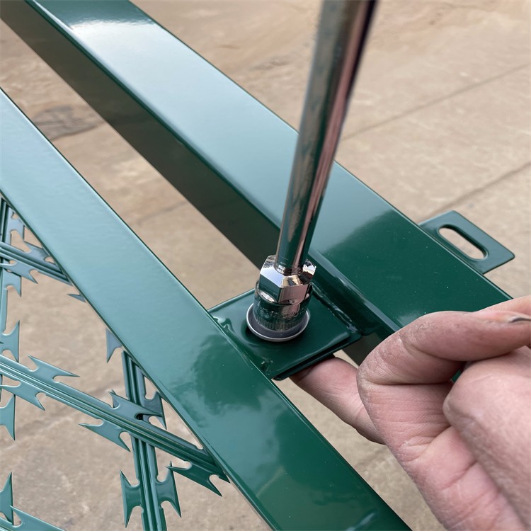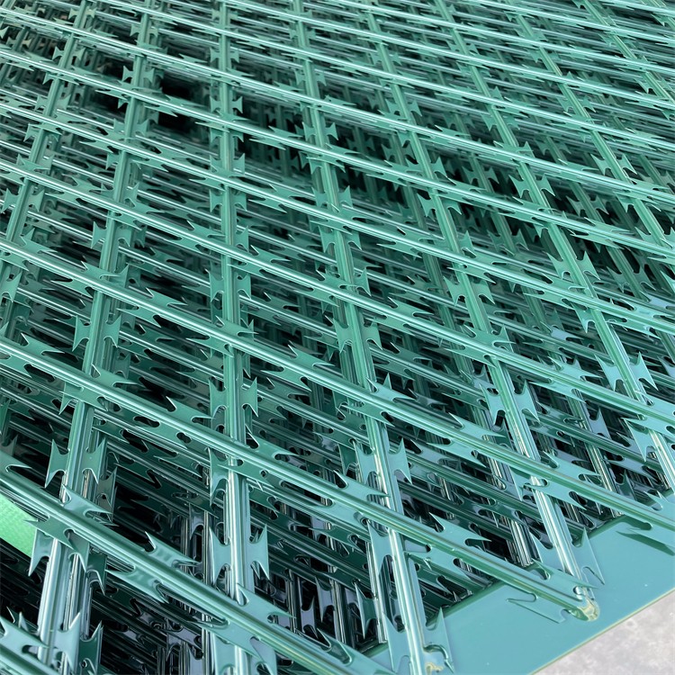 如若在監獄護欄網的頂部加裝刀片刺絲或刀片刺繩,則能進一步增強其安全防護性能。該產品采用了電鍍、熱鍍、噴塑、浸塑等防腐形式,因此具有很好的抗老化、抗曬、耐候等特點。其產品造型美觀、花色多樣,既起到了圍欄的作用,同時也美化了環境。由于具有高安全性以及良好的防攀爬能力,網片連接方式采用了特制的SBS緊扣件,有效防止了人為的破壞性拆卸。此外,該產品還橫向四道折彎加強筋,使網面強度顯著增加。