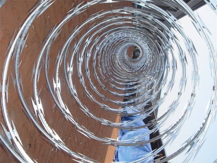 圍墻倒刺鋼絲網(wǎng)的直徑一般是50公分和60公分。我廠備有大量現(xiàn)貨,當天可發(fā)貨。刀片刺繩為熱鍍鋅鋼板經(jīng)過沖壓而成的刀片形狀的防護網(wǎng),圈經(jīng)為50厘米,螺旋覆蓋長度為10米-12米。