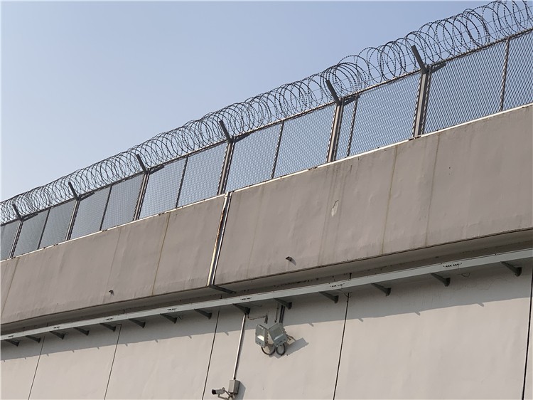 監獄防護欄具有防腐、防老化、抗曬、耐候等特點。螺旋型交叉刀片刺網是在兩條刀片刺網之間以不銹鋼片和鍍鋅鋼片強力夾扣,展開后即呈交叉狀,美觀又實用。