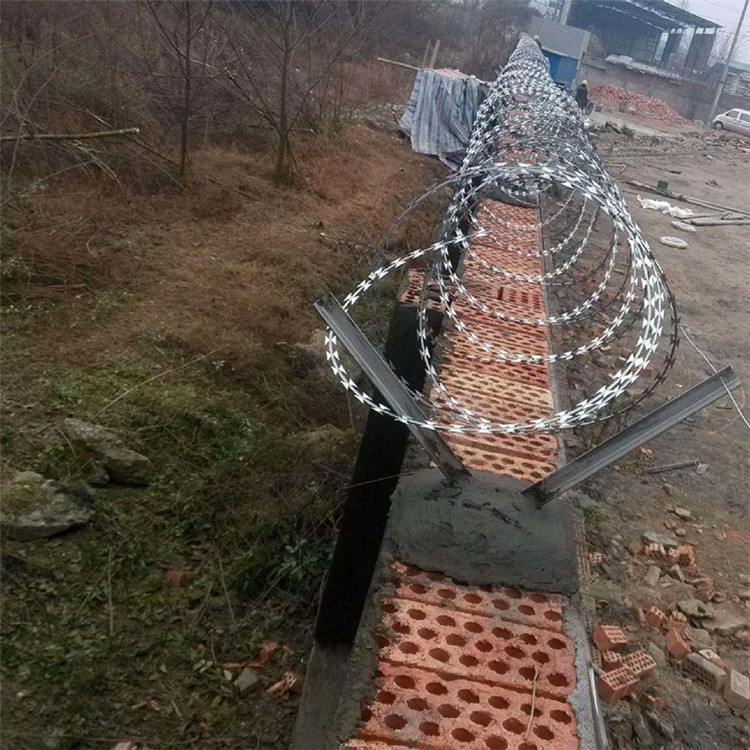 再有一種是由熱鍍鋅鋼板或不銹鋼薄板沖壓出尖銳的刀片狀,高張力鍍鋅鋼絲或者不銹鋼絲做芯組合而成的帶刺鐵絲網(wǎng)。這種刀片狀的鐵絲網(wǎng)可成螺旋狀,也可成網(wǎng)片狀。