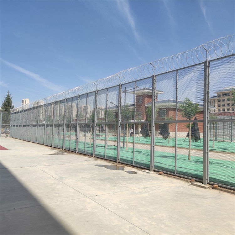 看守所防護圍網高度總體高度一般為:3米--4米高,立柱跨度間距為3米,邊框為20X30方管,也有使用30X30或者30X50的方管,網孔為:70X150mm、50X100、60X120等,絲徑為:4mm-6mm,立柱規格為:60X60、80X80、100X100方柱,V字高度為:50cm,立柱壁厚:2mm-3.5mm,法蘭盤規格為:200X200X10mm,整體全部采用鍍鋅材質浸塑或者靜電噴涂。連接方式網片邊框打孔。立柱焊接邊耳用螺絲連接。頂部加焊大V字型網片,用來支撐蛇腹型刀刺網,這樣組裝起來的看守所防護圍網堅不可摧。