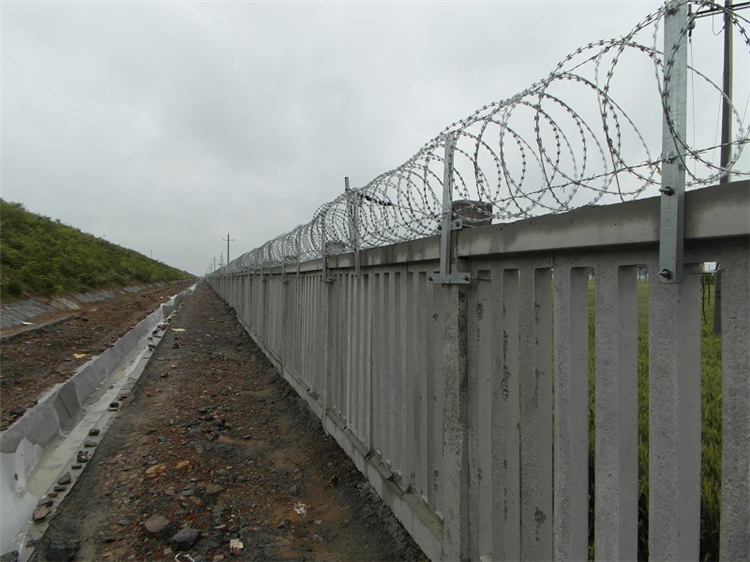 刀片刺繩由沖切鋼板采用機械壓軋在鋼絲上成型,刀刺寬度22mm,兩刃垂直間距15mm,刀刺縱向間距34mm,芯絲直徑為2.5mm。刀片采用厚度0.5mm的Q195鋼板沖切制作,芯絲由HPB300?6.5mm高線鋼絲加工。 刺絲滾籠的下緣距離鋼筋混凝土防護柵欄上緣的垂直距離為0.05m。