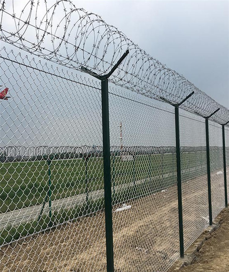 鋁包鋼機場圍界是新型的機場隔離網,它是由Y型燕尾立柱、鋁包鋼勾花網、鋁包鋼刺絲網組成鋁包鋼機場圍界具有獨具匠心的鋼絞線穿插式連接立柱和網片,在保證美觀大方的同時,能夠承受20 kN推力的鋁包鋼絞線使整體圍界足夠堅固。