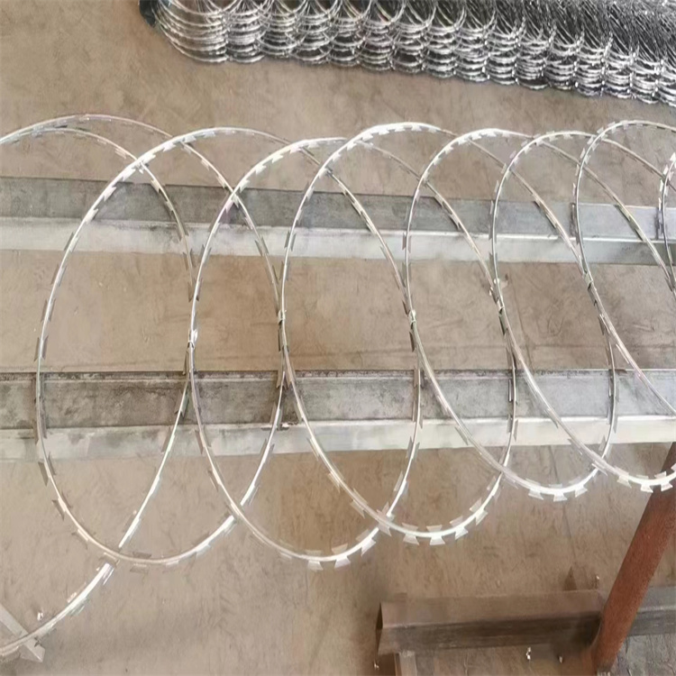 刀片刺網的排列密度根據場所的不同要求不同,監管區要求不小于10圈/m,相鄰每圈監獄不大于200mm,覆蓋一米的重量約為1.5公斤。對于鐵路刺絲滾籠的安裝間距,鐵路部門有明確要求覆蓋1.5公斤/m。當然了如果是自己私人采用就沒有明確要求了。
