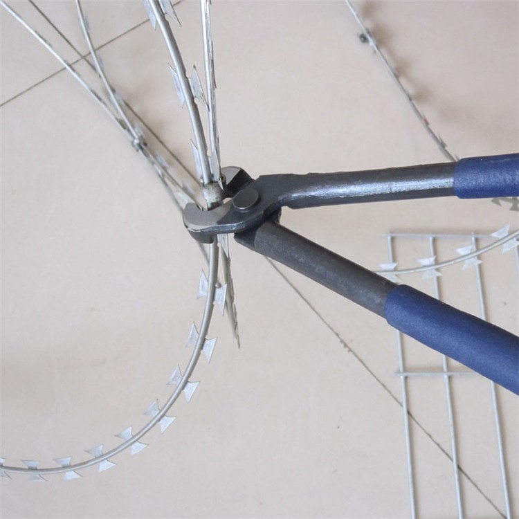 它采用鋼板(刀板)沖壓成型包附于熱鍍鋅鋼絲(芯線)之上,由銳利尖角鍍鋅鋼板或不銹鋼薄板做刀片,高張力鋼絲做芯線組合而成的。