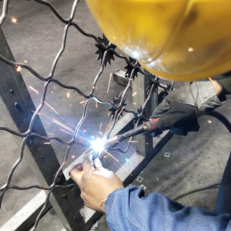 戒毒所隔離網之梅花型隔離網,它是單層梅花刺網,梅花刺直徑不小于7.5cm,刺片厚1.5mm,采用Q235低碳鋼板沖壓而成,網片為鋼絲焊接而成的菱形網孔網片,一般網孔為110*110mm,網絲直徑一般為5mm,每一個網絲的交叉點焊接一個梅花刺。